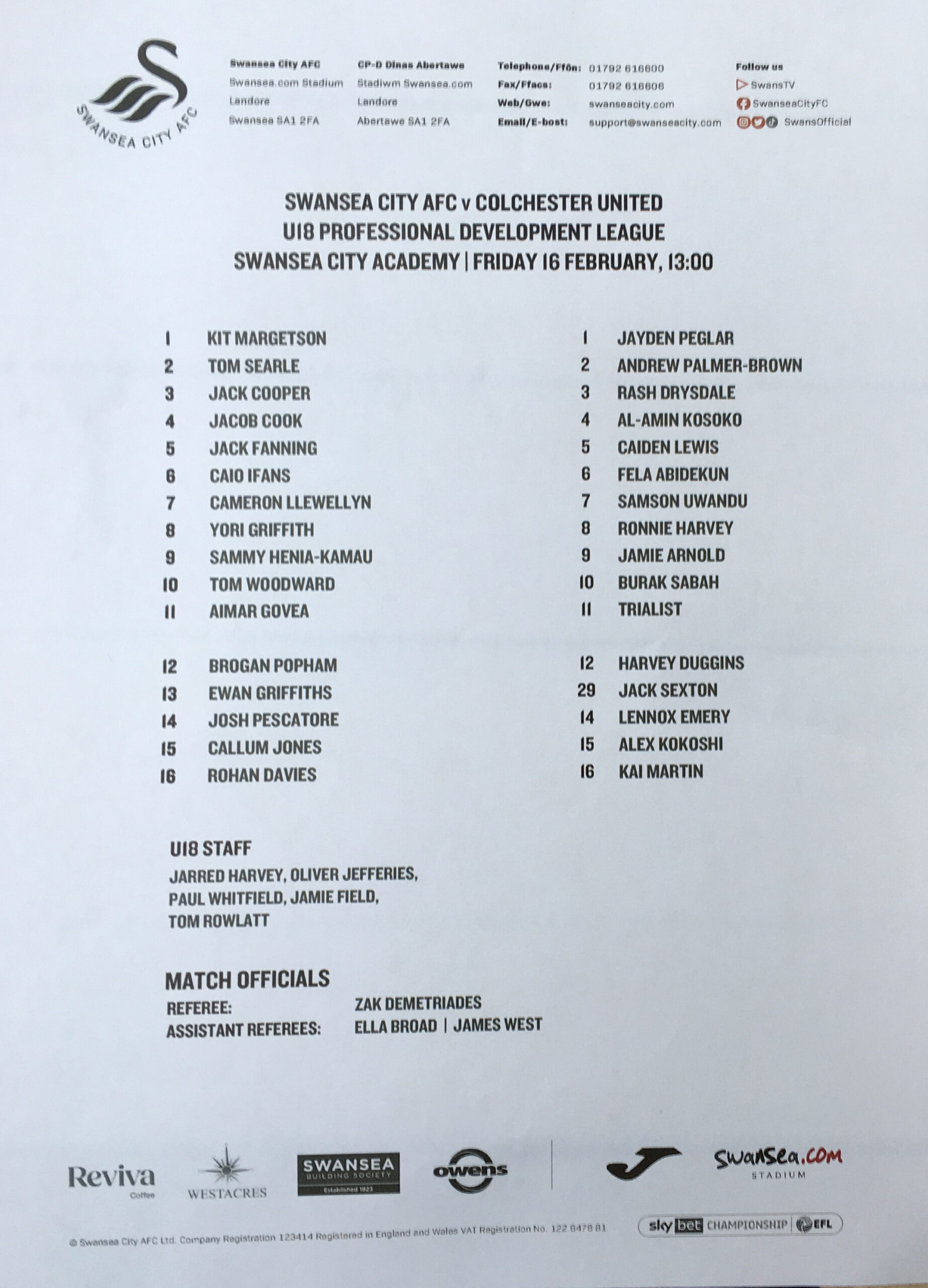 A word also for our U16 left winger Callum Jones who – after his introduction with 20 minutes to go – gave Colchester’s right back Palmer-Brown an absolutely torrid time for the remainder of the match. He’ll no doubt be carefully managed, but hopefully we’ll see a lot more of him in future.
