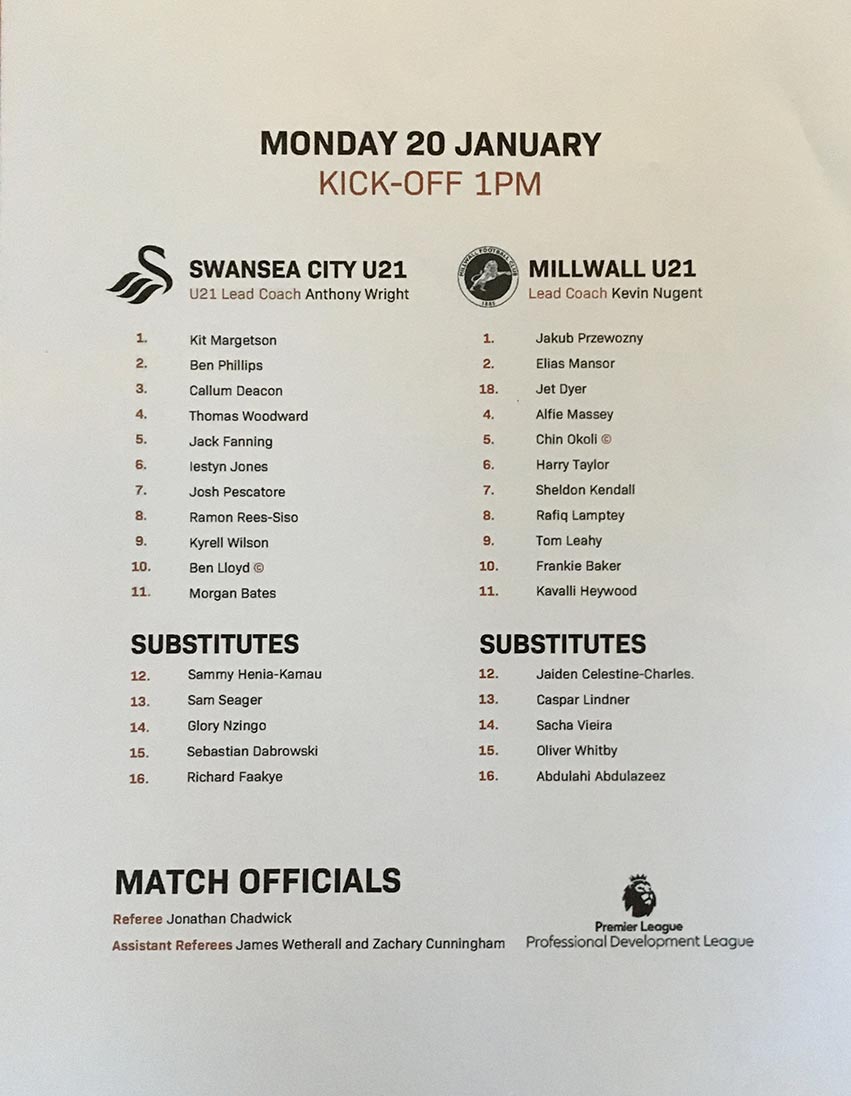 Kit Margetson went down injured a couple of times before the decision was taken to replace him with debutant Seager. We finished the half on top and with both Wilson and Woodward looking particularly dangerous. Phillips, who got to grips with Millwall’s tricky left winger Heywood, struck up an effective linkup with Josh Pescatore ahead of him and this was a prominent source of Swans attacks, with Wilson, Woodward and Bates lending a lot of support to keep the Millwall defence on its toes.