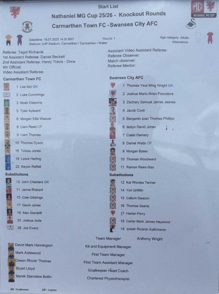 After we reacted positively to an unexpected equaliser, our U21s completed a comfortable 4-1 victory over Carmarthen in Round 1 of this season’s Nathaniel MG Cup. There was a crowd of 572 at Richmond Park for a pleasant day in the sun. Carmarthen play one division below the Cymru Premier and finished 7th in Cymru South last season. Former Welsh international midfielder Mark Aizlewood is head coach, former Swans Tom Dyson, Will Rickard, Cole Gibbings featured in the Old Gold squad today.